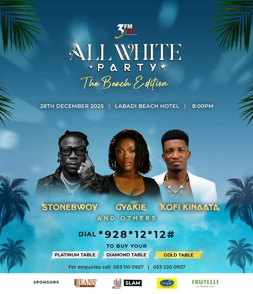 COUNTDOWN to the biggest beach party of the year has begun! 🌴🔥. 3FM presents the All White Party: The Beach Edition featuring the incredible Stonebwoy, Gyakie, and Kofi Kinaata! Call the following numbers for more details: +233 (0)53 220 0927 +233 (0)53 110 0927 Don't miss out on the ultimate end-of-year celebration. Dial *928*12*12# to...
