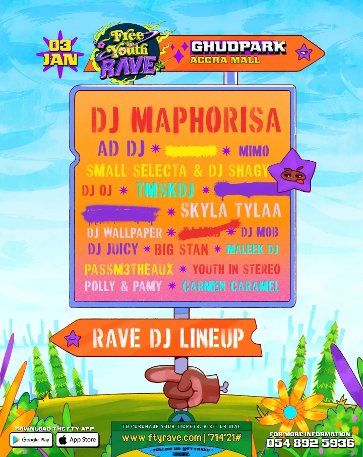 FTY RAVE | JAN 3 2025 Official DJ Lineup! 🎶 Start your year with a bang! DJ Maphorisa and the hottest DJs take over Free The Youth Rave on Jan 3rd at GhudPark! Let’s rave! Secure your tickets now at www.ftyrave.com or Dail *714*21#. General admission tickets start at GH₵150. Call 054 892 5936 for...