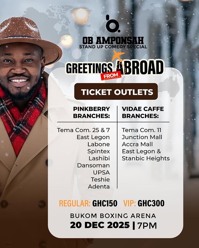 OB Amponsah presents a Comedy special titled Greetings from Abroad at the Bukom Boxing Arena. Tickets go for: Standard - ₵150 VIP - ₵300 Dial *713*33*10# to buy tickets. Call +233 (0) 54 5246478 for table reservations. If you are not in Accra, you could stream this live on Cinemax!